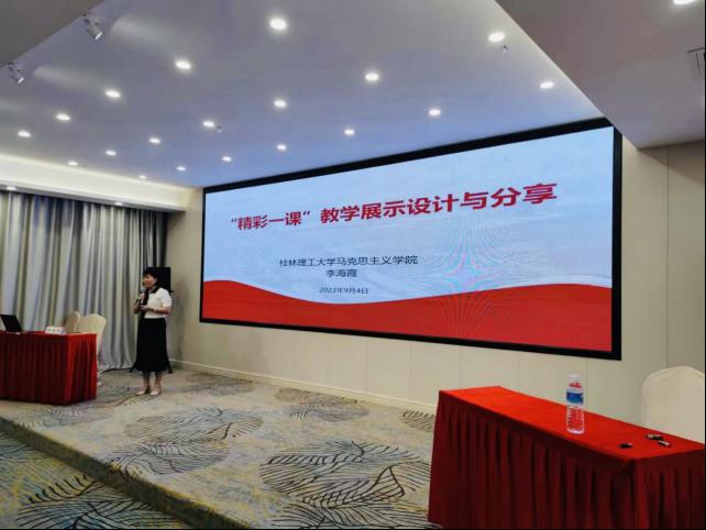 9月4日下午,李海霞教师受邀为此次培训学员做了现场教学展示,她以现场教学展示设计和现场教学PPT制作为切口,结合2023年版教材第一章第二节第一目《高尚的人生追求》进行了精彩的现场教学展示,得到了广大参会学员和广西高校“德法课”分教指委委广西大学陈洪涛教授的一致好评和高度赞扬。